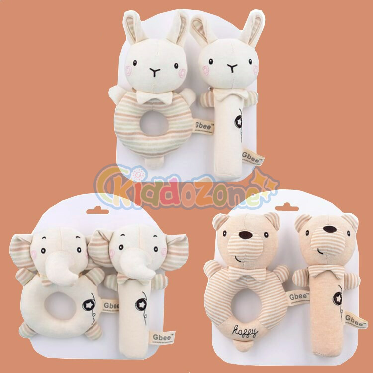 KiddoZone 2PCS婴儿摇铃儿童有机棉软挤压摇铃可爱动物安抚手摇铃毛绒手铃玩具BB声音0-3岁男孩女孩婴儿教育玩具